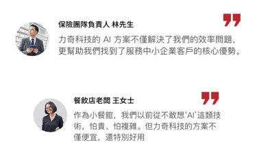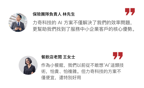 截至目前, 我們已成功服務超過500家中小企業, 涵蓋保險、直銷、零售、專業服務等多個行業。每一個成功案例都見證了 AI 技術如何幫助傳統企業煥發新的生命力。